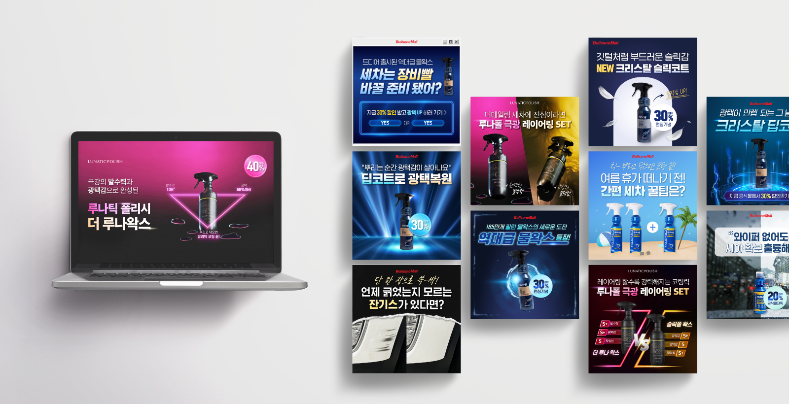 국내 자동차 애프터 마켓의 선두주자 불스원의 직영몰에서 판매하는 다양한 세차 용품 및 악세서리들의 매출 극대화를 위한 광고를 집행하고 있습니다. 오프라인 시장에 집중되어 있던 판매 채널을 온라인으로 확대하는 시작에 함께하며, 불스원의 제품이 온라인에서도 소비자들에게 매력적으로 다가갈 수 있도록 몰의 특성과 현황을 점검하고 오프라인과 온라인 소비자들의 차이를 분석한 소재들을 제작하여 성과를 개선했습니다.